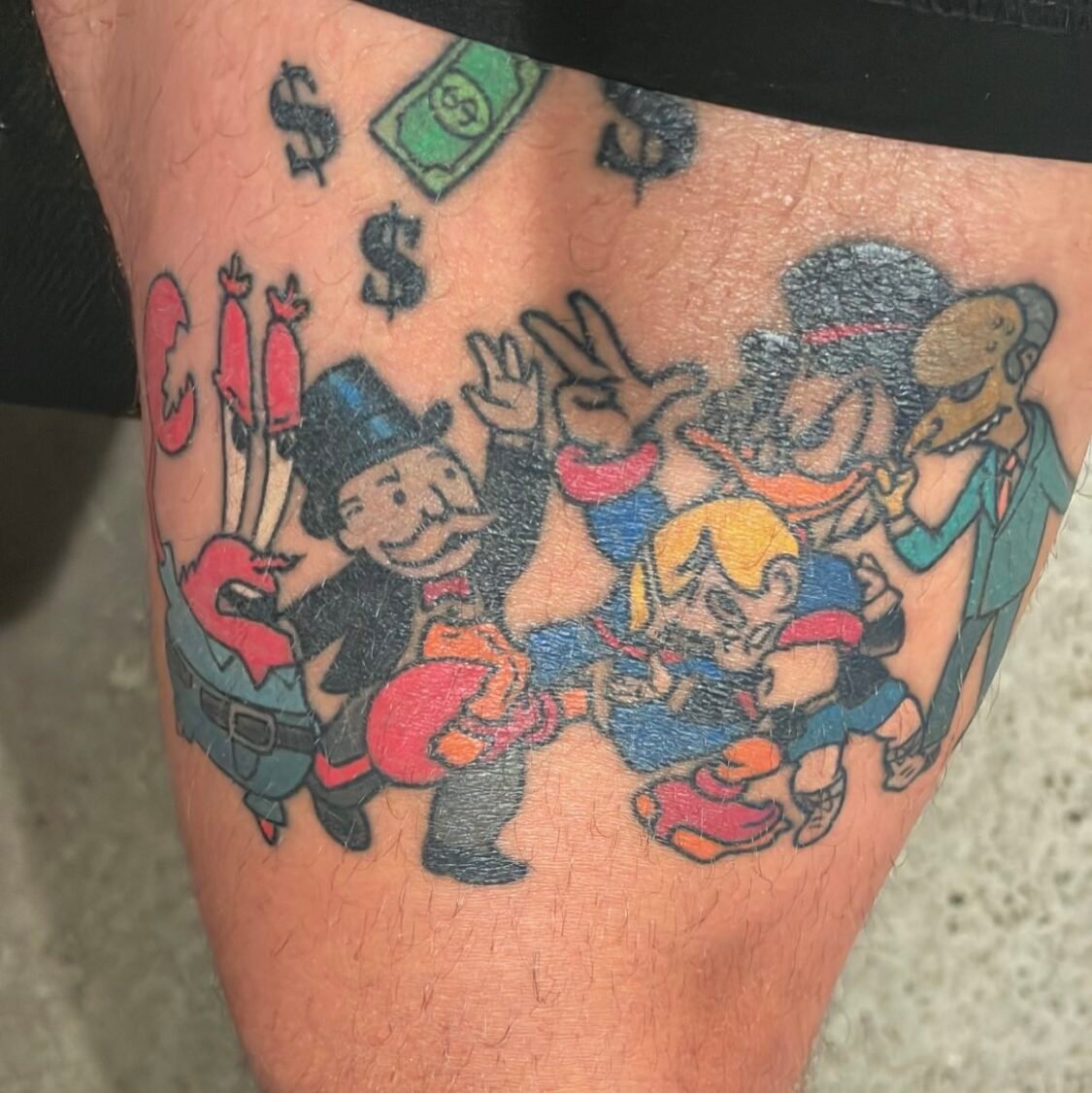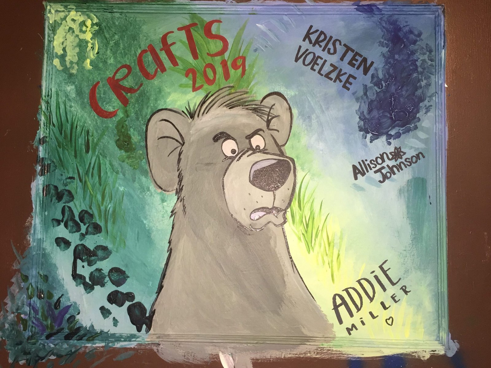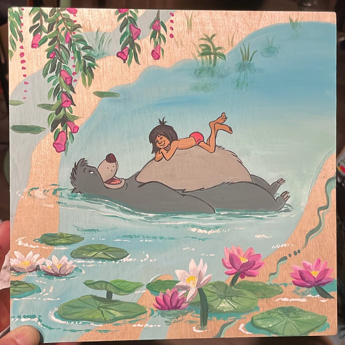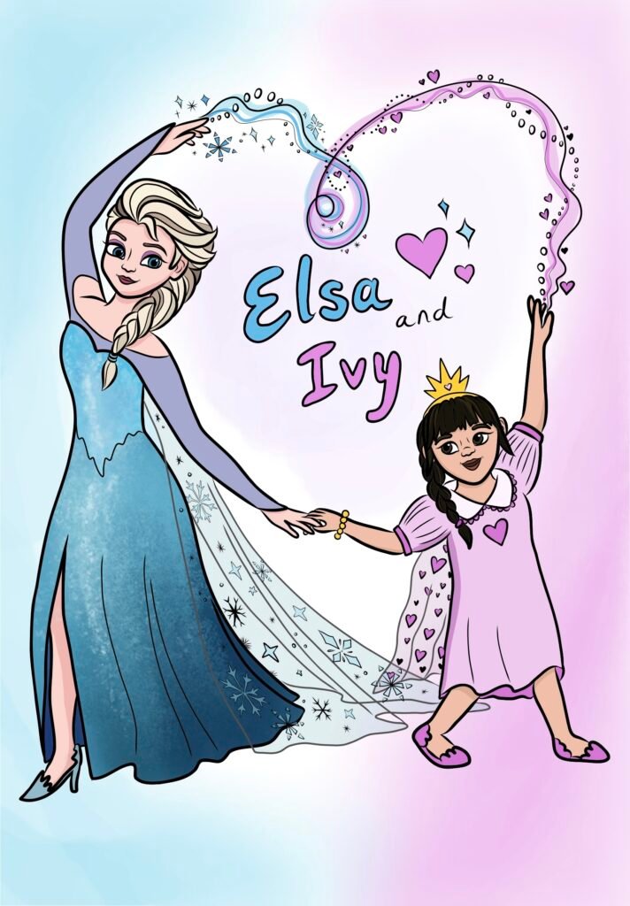 Some were rearranged to create an image that flows and makes sense. Such as Elsa was adjusted to pose with the cartoon version of my friends daughter, Baloo/Mowgli are floating but the background is my creation or the money-grabber tattoo was a character colab through my orientation/layout but of reference to the original characters)